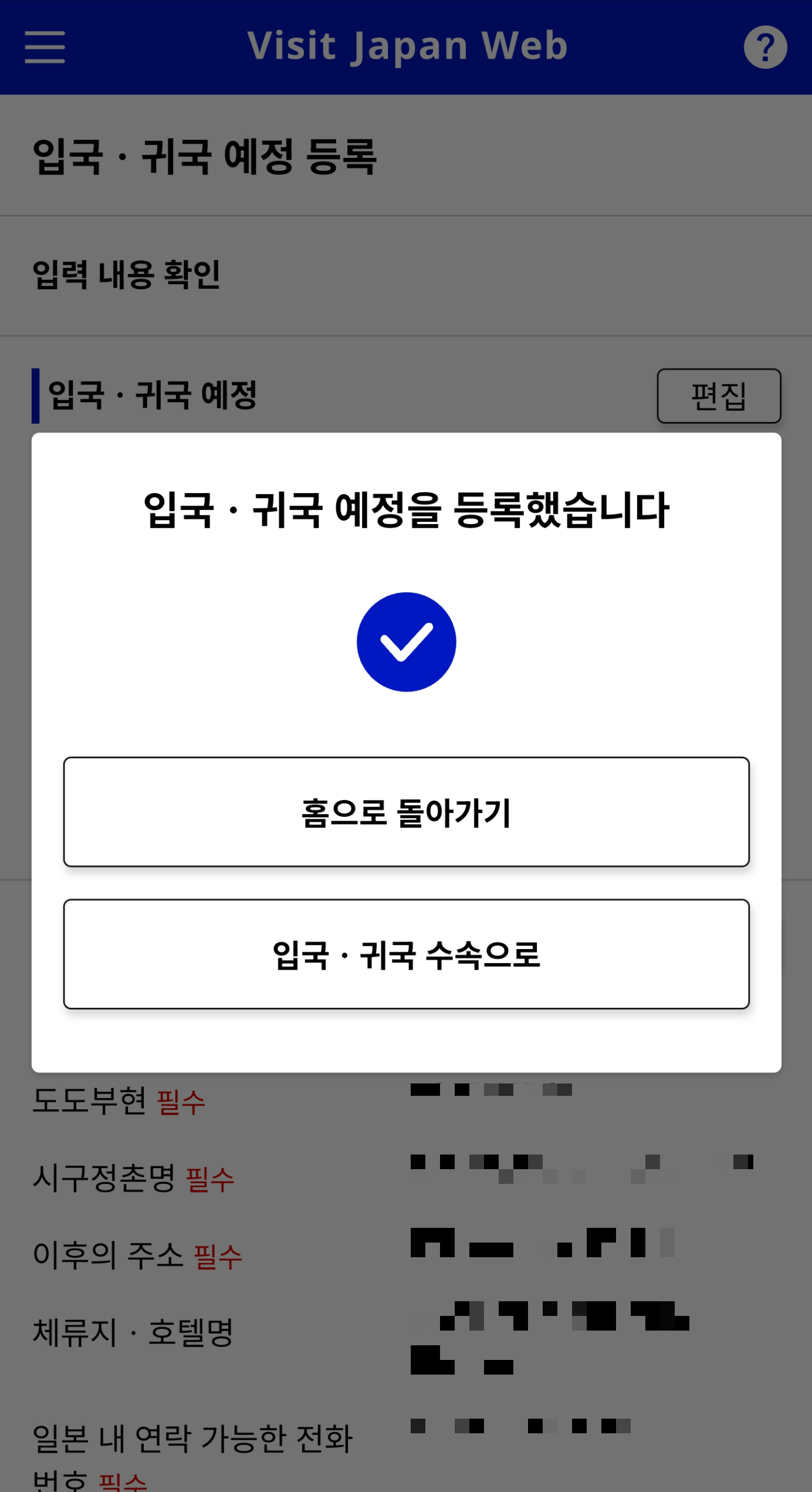 위 입력 과정을 모두 마치면, 이제 입국·귀국 예정 정보를 등록하는 단계로 넘어갑니다.